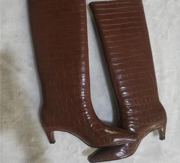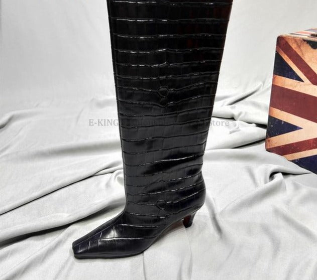 Croc Embossed Wide Knee High Kitten Heel Boots