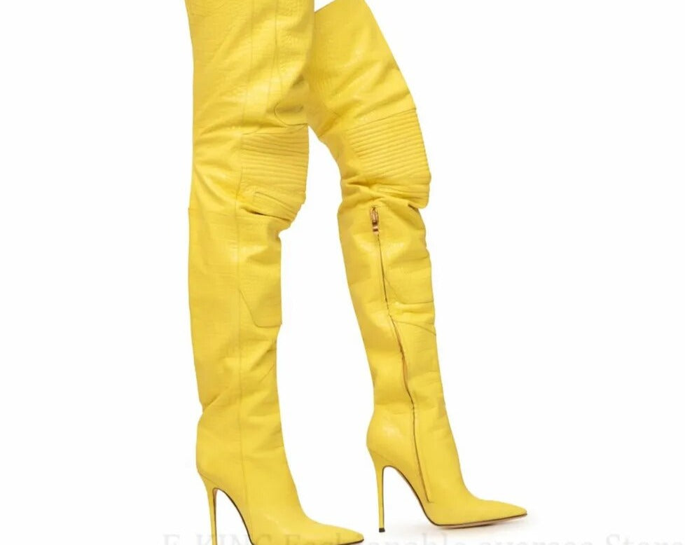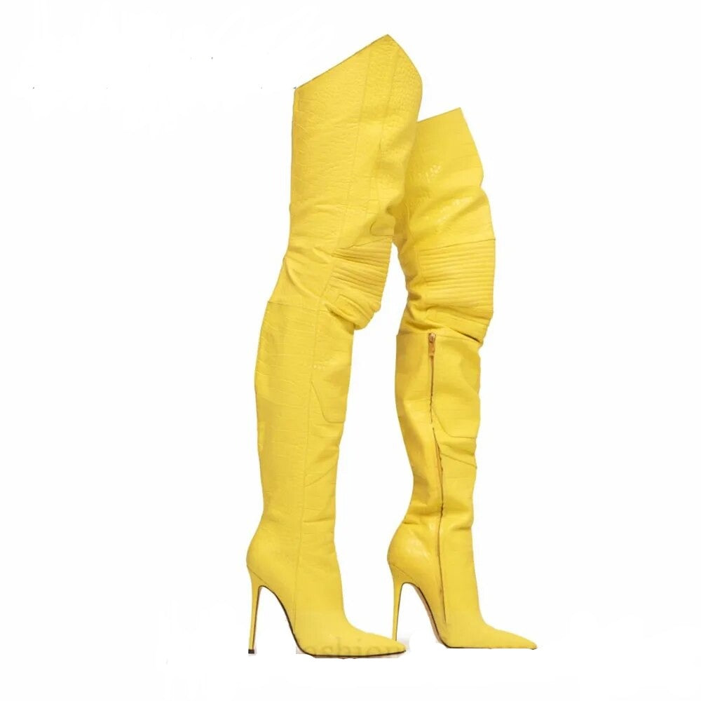 Snake Print V Cut Thigh Length High Heel Boots