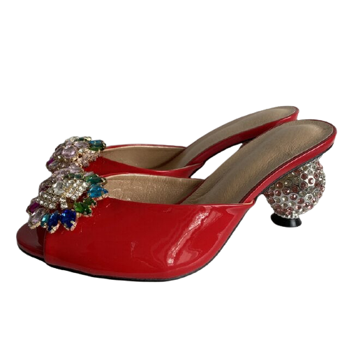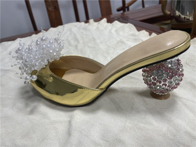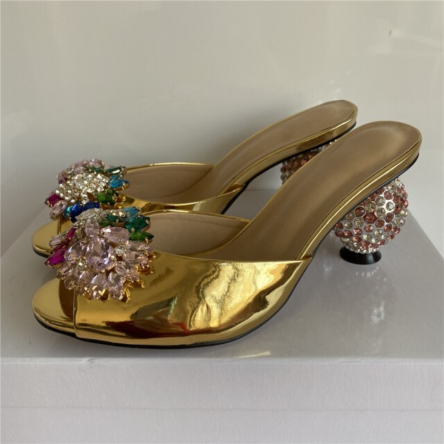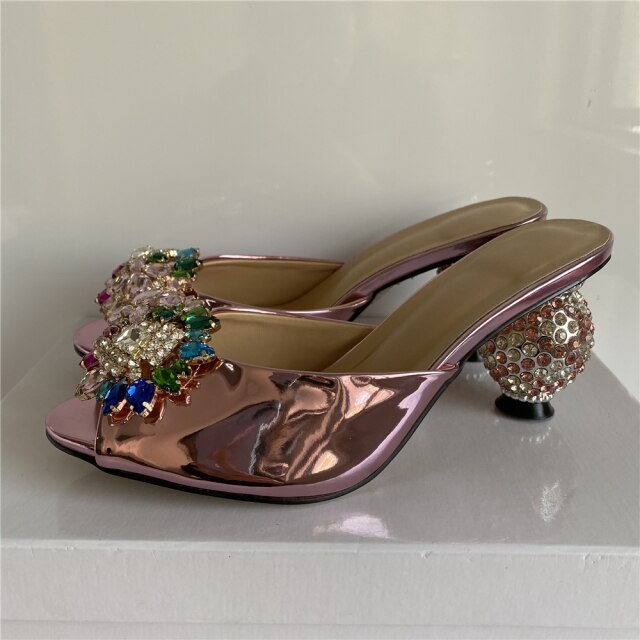 Rhinestone Flower Crystal Ball Kitten Heel Mules
