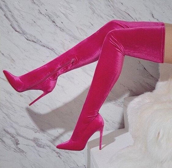 Pink Velvet Thigh High Stiletto High Heel Sock Boots
