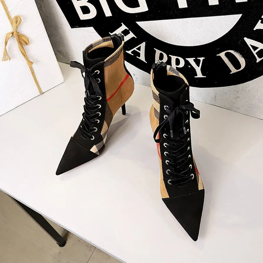 Plaid Lace Up Ankle High Heel Boots Inspired Burberry