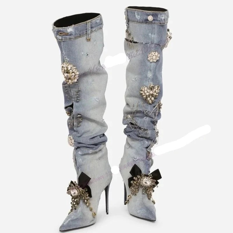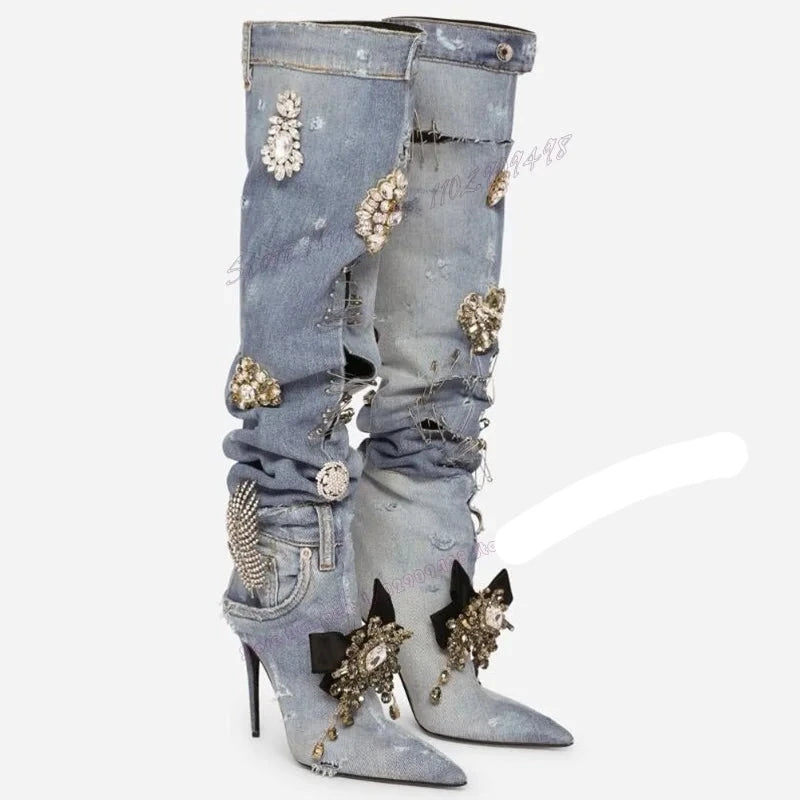 Patchwork Rhinestone Pendants Denim Boots Inspired By Dolce&Gabbana