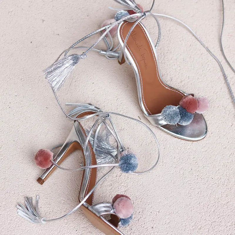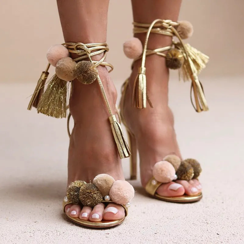Pom Pom Tassel Strap Lace Up High Heel Sandals