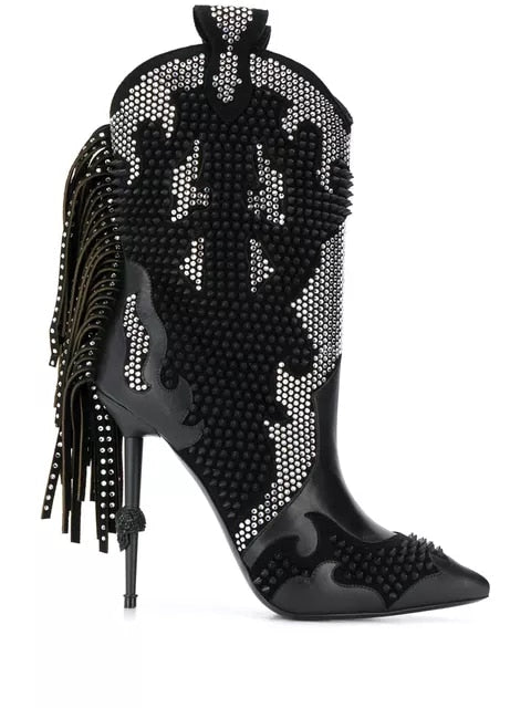Crystal Detail Fringe Western Cowgirl High Heel Boots
